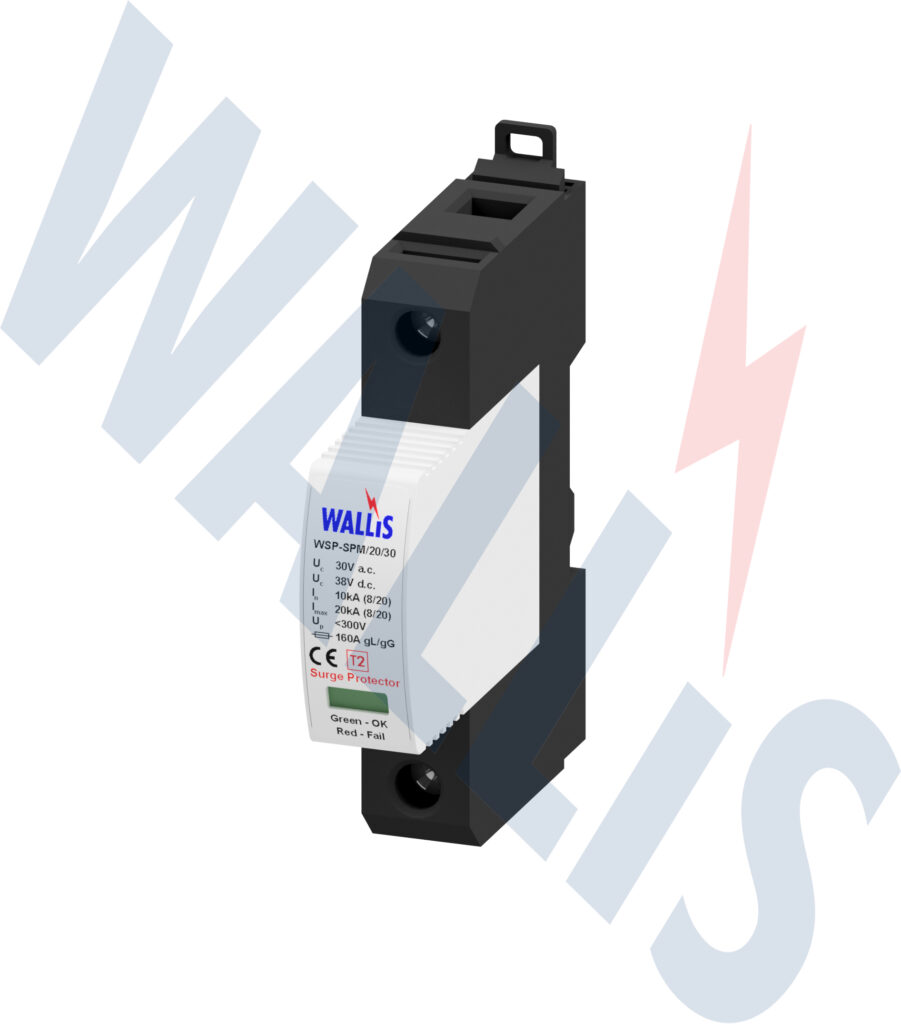 The WSP-A1SPM/20/30R is a type 2 surge arrester according to BS EN 61643-11. The device consists of a base part and pluggable module.